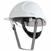 Ein besonderes Highlight ist die optionale Schutzbrille auf der Helminnenseite, geprüft nach EN 166 F, optische Güteklasse 1. Sie bietet 100 % UV-Schutz bis 400 nm und ist bei Bedarf schnell ein- oder ausgeklappt, ideal für Arbeiten, bei denen freie Sicht nach oben erforderlich ist.