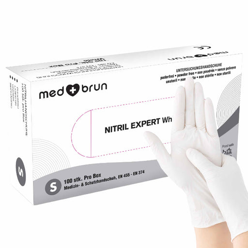 Vollständige Details anzeigenNitrilhandschuhe Weiss | latex- & puderfrei | mikrogeraute Fingerspitzen | Medbrun Expert