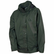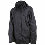Die Regenjacke verfügt über eine zentrale Reissverschlussöffnung mit Druckknöpfen, breite Vordertaschen mit Patte sowie eine im Kragen integrierte Kapuze, die bei Bedarf schnell einsatzbereit ist. Eine verstellbare Taillenweite und justierbare Ärmelbündchen ermöglichen eine individuelle Passform und zusätzlichen Schutz vor Wind und Nässe.