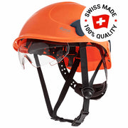 Ein besonderes Highlight ist die optionale Schutzbrille auf der Helminnenseite, geprüft nach EN 166 F, optische Güteklasse 1. Sie bietet 100 % UV-Schutz bis 400 nm und ist bei Bedarf schnell ein- oder ausgeklappt, ideal für Arbeiten, bei denen freie Sicht nach oben erforderlich ist.